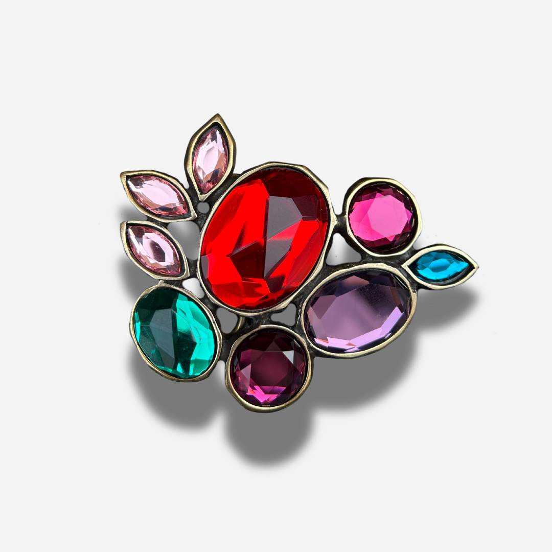 Cette boucle de ceinture interchangeable Yolète N301 se distingue par son design bijou et son éclat spectaculaire. Sa composition de pierres facettées multicolores crée un jeu de lumière intense, mêlant rouge profond, vert émeraude, rose, violet et touches turquoise. Chaque pierre est soigneusement sertie pour former une silhouette harmonieuse et expressive, faisant de cette boucle Yolète une véritable pièce de déclaration.