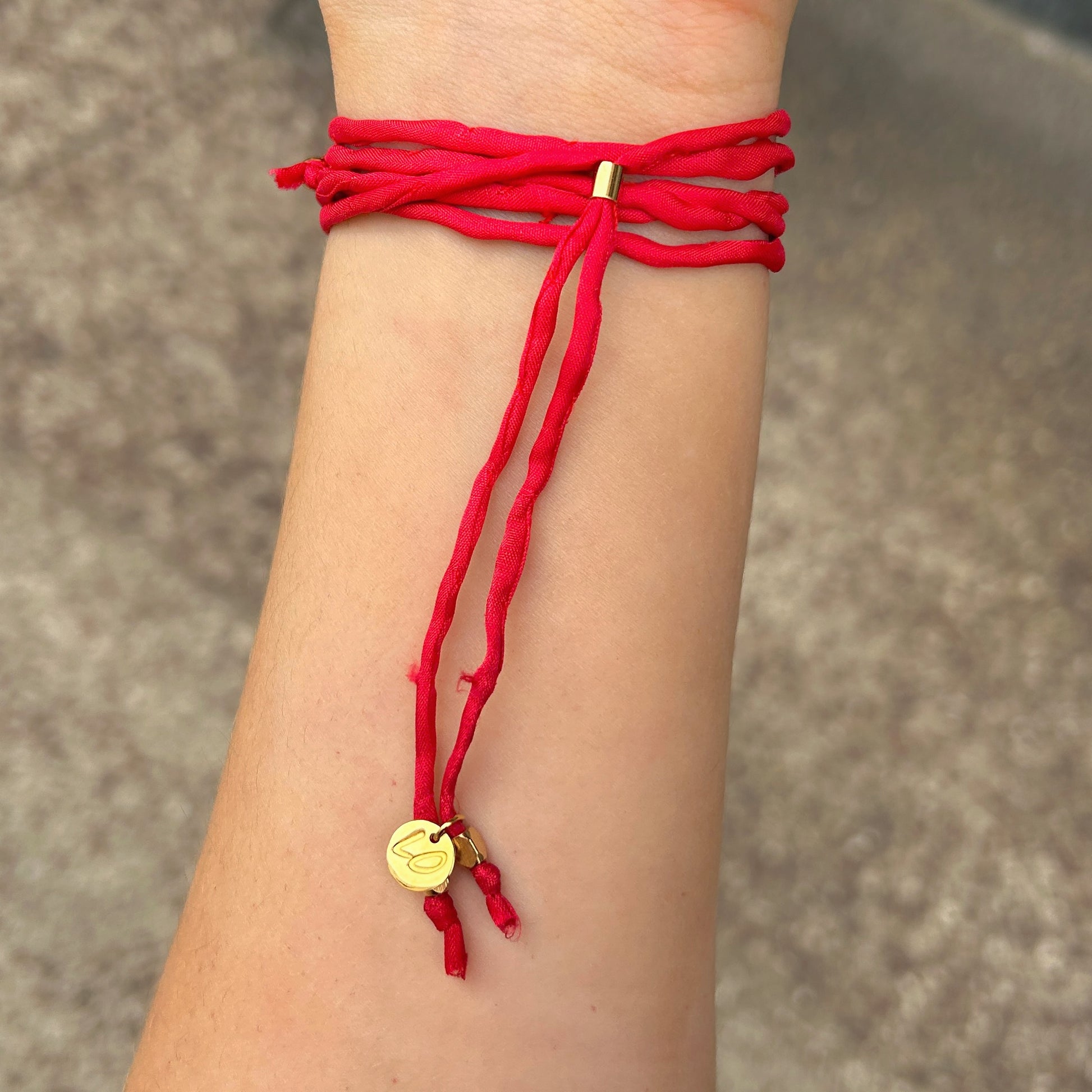 Un ruban rouge intense enlace le poignet comme une déclaration. Ce bracelet signé Au Fil de Lo mêle la souplesse vibrante du sari indien à l’éclat d’un mot universel : AMORE. Les lettres gravées sur cinq médailles dorées martelées dansent à la lumière, chacune ponctuée d’un éclat cristal discret.