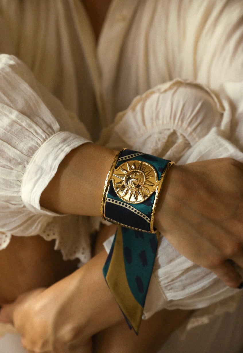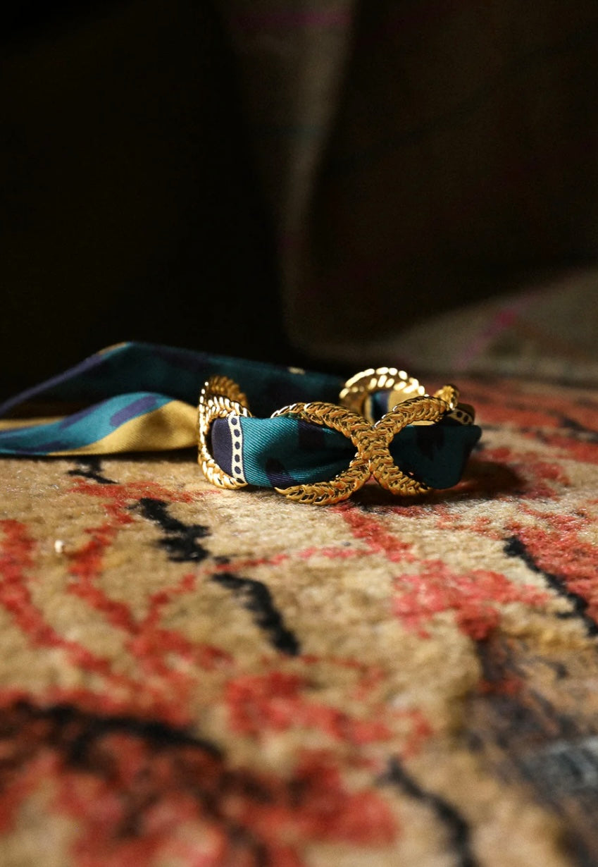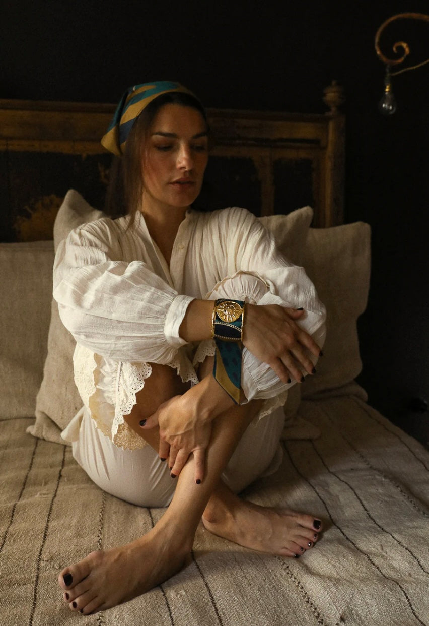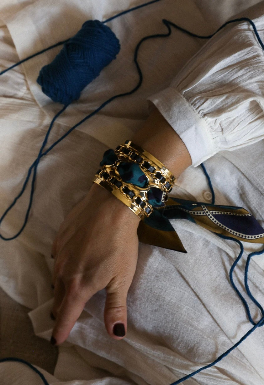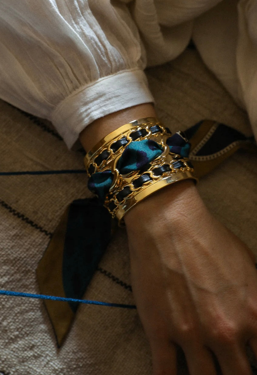 À enrouler autour du poignet, dans les cheveux, sur l’anse d’un sac ou glissé dans une coiffure, il se porte aussi noué sur une manchette ou un ornement AN-NÉE, révélant alors toute sa dimension créative et raffinée. Plus qu’un accessoire, c’est une déclaration de style, pensée pour celles et ceux qui cultivent l’audace et la singularité au quotidien.