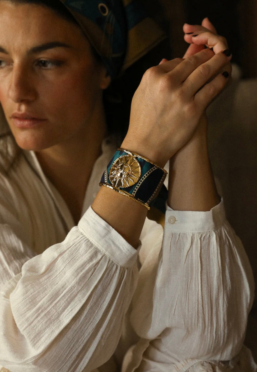 Vibrant et instinctif. Le ruban Chapanoir Olive signé AN-NÉE ose le contraste entre un vert olive solaire et des touches de bleu profond. Inspiré des motifs félins revisités dans une version graphique et contemporaine, il incarne l’élan sauvage d’un esprit libre.